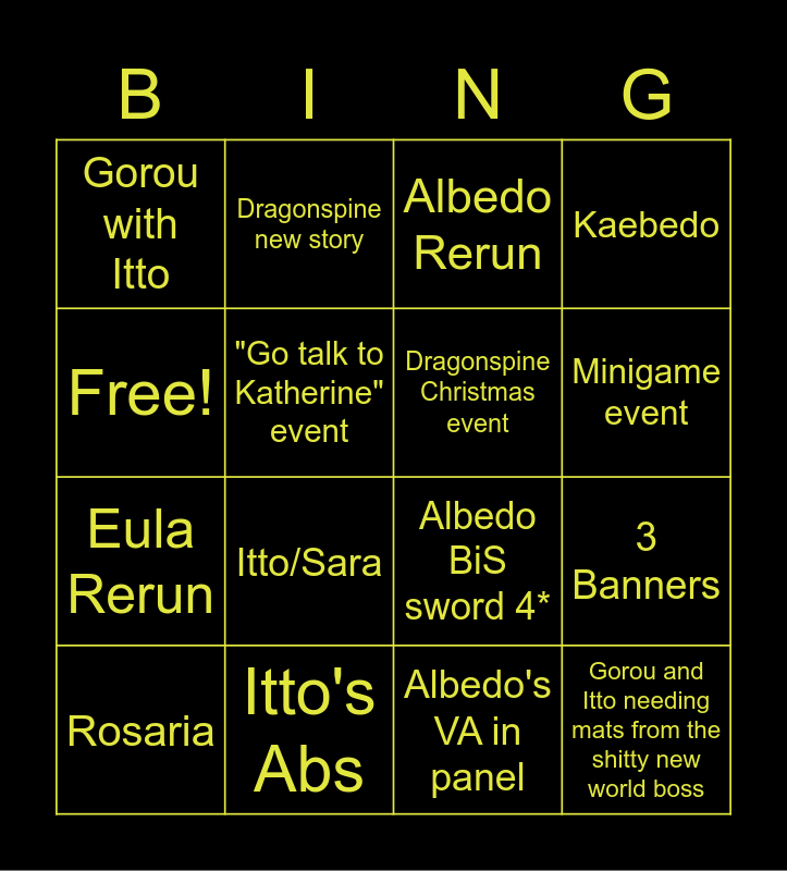 This bingo card has 16 words: Itto's Abs, 3 Banners, Albedo Rerun, Gorou with Itto, Eula Rerun, Dragonspine new story, Albedo BiS sword 4*, Albedo's VA in panel, Free!, "Go talk to Katherine" event, Rosaria, Kaebedo, Itto/Sara, Minigame event, Dragonspine Christmas event and Gorou and Itto needing mats from the shitty new world boss.