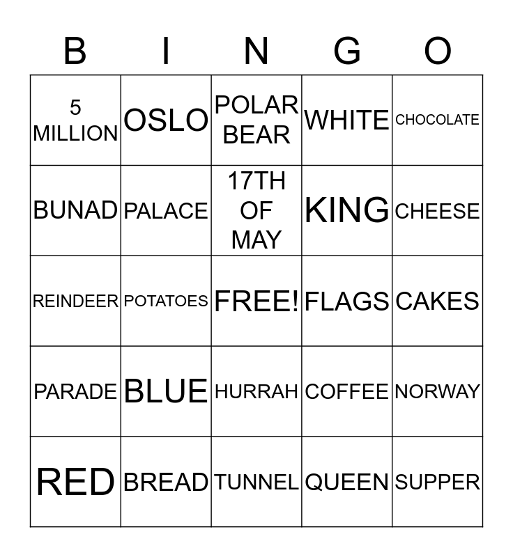 This bingo card has a free space and 28 words: NORWAY, SYTTENDE MAI, KING, QUEEN, BUNAD, POLAR BEAR, OSLO, PARADE, FLAGS, RED, REINDEER, WHITE, BREAD, TUNNEL, CHEESE, Northern Lights, BLUE, PALACE, 17TH OF MAY, HURRAH, 5 MILLION, FISH, SUPPER, POTATOES, CAKES, COFFEE, CHOCOLATE and SKI JUMPING.