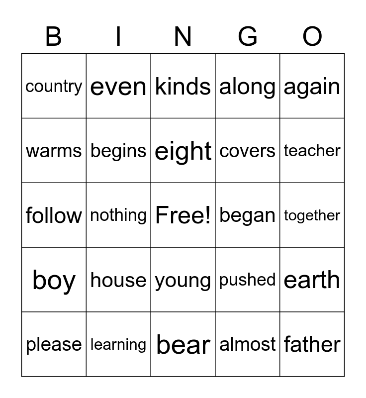 This bingo card has a free space and 40 words: baby, follow, years, begins, learning, young, eight, until, again, boy, nothing, along, father, together, began, house, ready, country, soil, kinds, earth, almost, covers, warms, buy, myself, school, city, party, seven, family, please, above, pushed, teacher, bear, studied, toward, even and suprised.