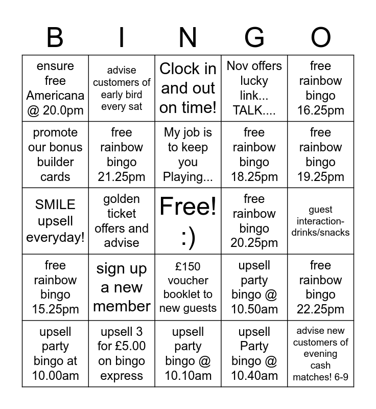 This bingo card has a free space and 24 words: sign up a new member, upsell 3 for £5.00 on bingo express, My job is to keep you Playing..., upsell party bingo at 10.00am, free rainbow bingo 16.25pm, ensure free Americana @ 20.0pm, promote our bonus builder cards, advise customers of early bird every sat, free rainbow bingo 20.25pm, £150 voucher booklet to new guests, free rainbow bingo 18.25pm, SMILE upsell everyday!, upsell party bingo @ 10.50am, free rainbow bingo 22.25pm, free rainbow bingo 21.25pm, upsell Party bingo @ 10.40am, guest interaction-drinks/snacks, Clock in and out on time!, free rainbow bingo 19.25pm, golden ticket offers and advise, advise new customers of evening cash matches! 6-9, free rainbow bingo 15.25pm, Nov offers lucky link... TALK.... and upsell party bingo @ 10.10am.