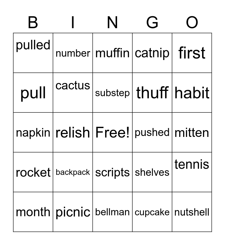 This bingo card has a free space and 24 words: backpack, picnic, substep, month, first, pulled, pull, number, pushed, scripts, thuff, napkin, shelves, tennis, cactus, cupcake, mitten, muffin, habit, relish, nutshell, rocket, catnip and bellman.