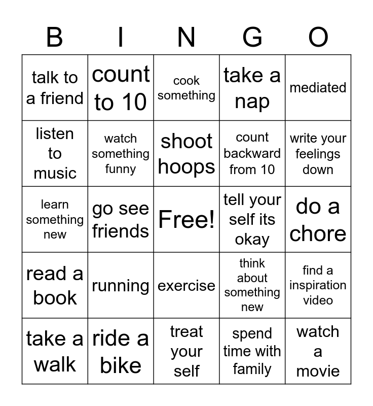 This bingo card has a free space and 24 words: running, ride a bike, shoot hoops, take a walk, mediated, talk to a friend, listen to music, count to 10, tell your self its okay, exercise, count backward from 10, learn something new, think about something new, find a inspiration video, watch something funny, spend time with family, do a chore, cook something, write your feelings down, go see friends, watch a movie, read a book, take a nap and treat your self.