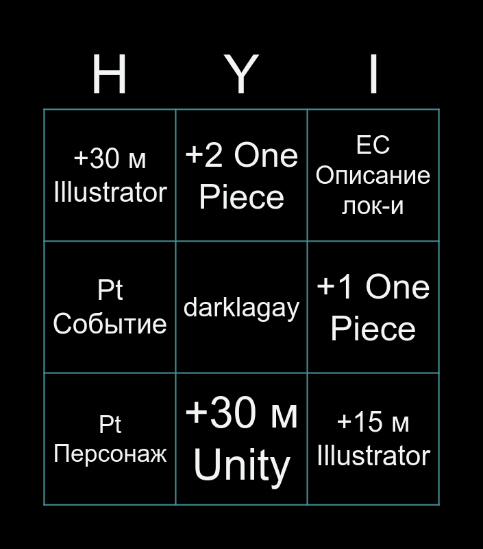 This bingo card has a free space and 23 words: +5 m Unity, +15 м Unity, +30 м Unity, +5 m Illustrator, +15 м Illustrator, +30 м Illustrator, +1 One Piece, +2 One Piece, Планка, Попить воды, Умыться, NFD, LM Скин, LM Моб, LM Босс, EC Руна, EC Описание лок-и, EC НПС\Босс, Pt Персонаж, Pt Описание, Pt Событие, +Игра в Tier and +Аниме в Tier.