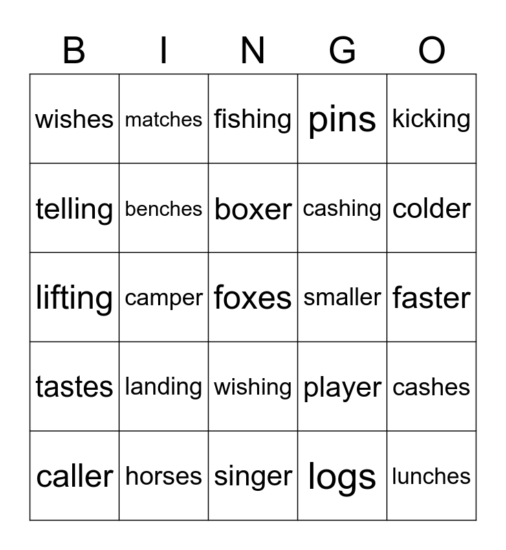 This bingo card has 46 words: bats, foxes, swinging, singer, landing, teacher, matches, cats, telling, banker, benches, pins, cashes, player, playing, jumper, boxer, smaller, mats, kicking, camper, logs, wishes, cashing, checks, colder, caller, fisher, wishing, tastes, taller, dishes, matches, boxes, dogs, horses, faster, higher, frogs, lamps, lunches, fishing, lifting, sending, thinking and holder.