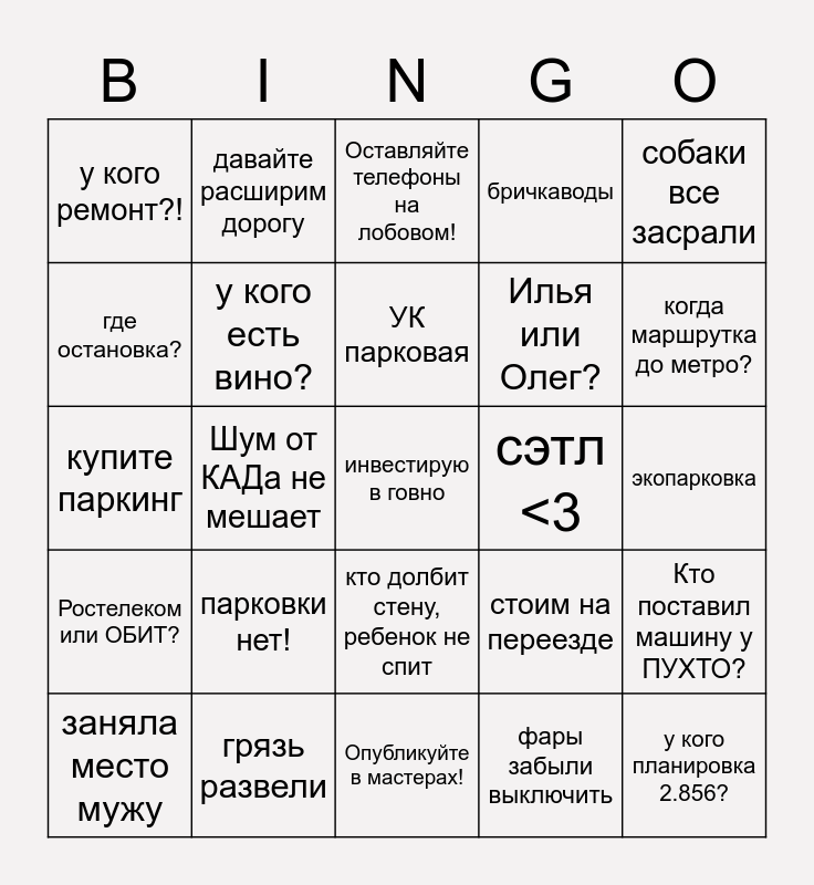 This bingo card has a free space and 24 words: парковки нет!, грязь развели, УК парковая, заняла место мужу, собаки все засрали, у кого ремонт?!, где остановка?, давайте расширим дорогу, сэтл <3, кто долбит стену, ребенок не спит, Илья или Олег?, купите паркинг, стоим на переезде, Кто поставил машину у ПУХТО?, у кого есть вино?, фары забыли выключить, экопарковка, Оставляйте телефоны на лобовом!, когда маршрутка до метро?, Шум от КАДа не мешает, у кого планировка 2.856?, Ростелеком или ОБИТ?, бричкаводы and Опубликуйте в мастерах!.