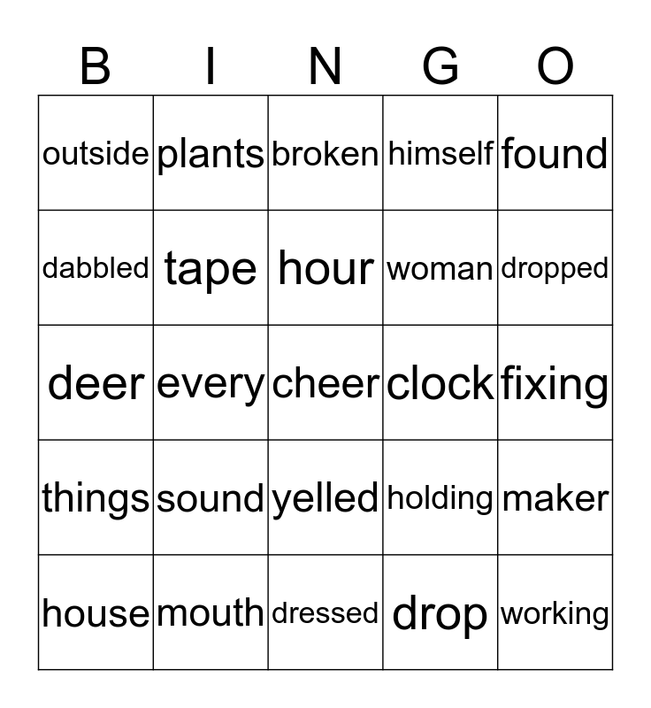 This bingo card has a free space and 24 words: sound, mouth, hour, house, found, outside, dabbled, plants, clock, yelled, woman, deer, holding, maker, tape, drop, fixing, broken, dropped, every, working, things, himself and dressed.