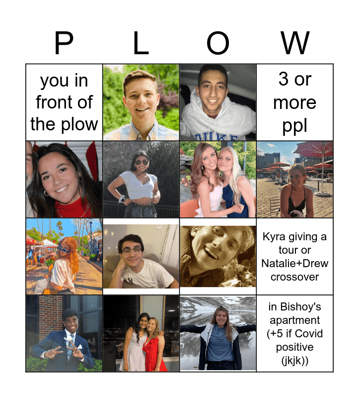 This bingo card has 12 images and 4 words: Kyra giving a tour or Natalie+Drew crossover, you in front of the plow, 3 or more ppl and in Bishoy's apartment (+5 if Covid positive (jkjk)).