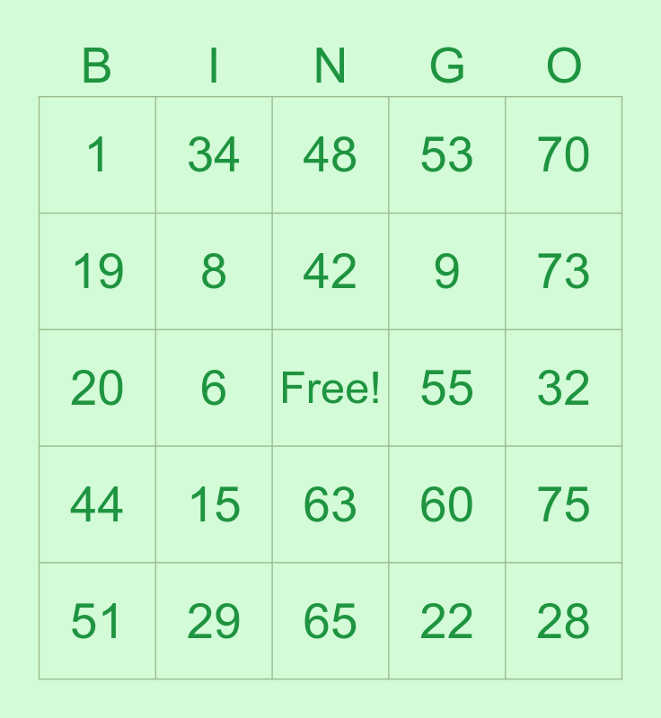 This bingo card has a free space and 24 words: 15, 29, 42, 51, 70, 1, 19, 34, 55, 63, 9, 20, 60, 75, 8, 22, 32, 48, 73, 6, 28, 44, 53 and 65.