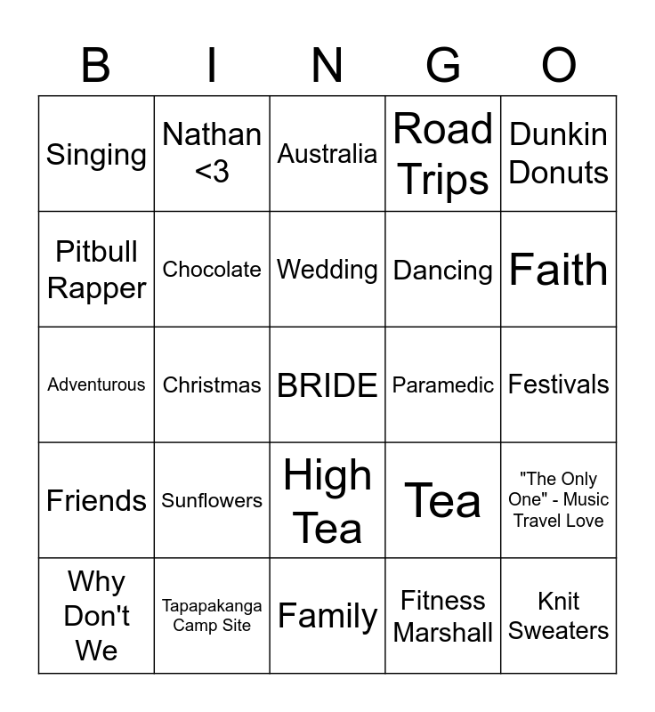 This bingo card has a free space and 38 words: 24/12, Netball, Love, Paramedic, "The Only One" - Music Travel Love, Friends, Christmas, Shamrock Cottage, Dancing, Faith, Pitbull Rapper, Chocolate, Fitness Marshall, Festivals, Singing, Sunflowers, Rave, Road Trips, Gracehill, Adventurous, Nathan <3, Family, Tea, Knit Sweaters, Horses, Partayyy, High Tea, Picnics, DJ Queen, Caring, Pancakes, Wedding, KFC, Dunkin Donuts, Why Don't We, Tapapakanga Camp Site, Australia and Caring.