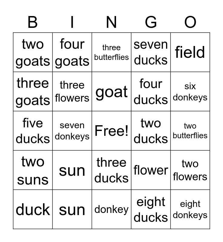 This bingo card has a free space and 25 words: sun, donkey, goat, duck, field, two goats, three goats, four goats, two ducks, three ducks, four ducks, five ducks, flower, two flowers, three flowers, four flowers, two butterflies, three butterflies, six donkeys, seven donkeys, eight donkeys, sun, two suns, seven ducks and eight ducks.