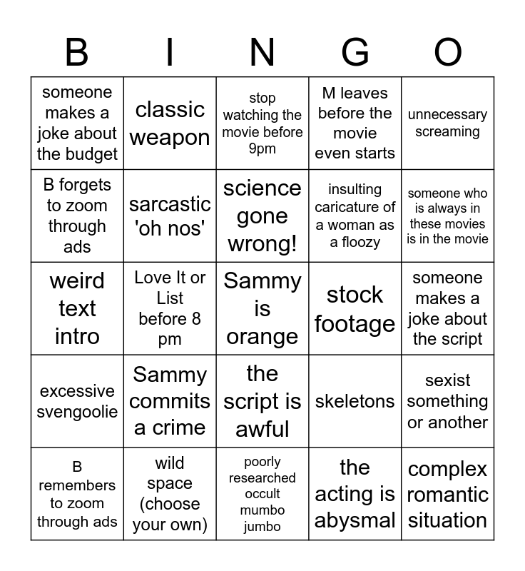 This bingo card has a free space and 82 words: strange and probably inaccurate accent, K gets up to mess with Sammy, stop watching the movie before 9pm, stop watching the movie after 9pm, era inconsistencies (think horse-drawn carriages in the 70s), something doesn't make any sense at all, M comments from the other room, replaying like all of a previous installment in a series, at least one cheesy special effect, K makes a corny joke, dramatic villain music, romance as a sidebar, sarcastic 'oh nos', stock footage, B makes a corny joke, someone makes a joke about the budget, B remembers to zoom through ads, B forgets to zoom through ads, poor quality local ad, svengoolie segue joke is actually funny, not just cheesy, lecher/sleazy character, insulting caricature of a woman as a floozy, complex romantic situation, unnecessary screaming, Love It or List before 8 pm, Three Stooges before 8 pm (RIP), product placement, Sammy has a spasm, comic relief, horror movie tunes, Sammy commits a crime, odd fake scientist monologue, weird text intro, monster villain, a kidnapping!, poorly researched occult mumbo jumbo, creepy child(ren), creepy old people, someone who is always in these movies is in the movie, no one who is always in these movies is in the movie, Sammy gets on the stereo to have a nappy, M leaves before the movie even starts, You can understand what M says from the other room, You can't understand what M says from the other room, iconic line (shouts to bon ami), classic weapon, we could've written this movie, science gone wrong!, rich man villain, scientist villain, someone makes a joke about the acting, someone makes a joke about the script, wild space (choose your own), questionable character stereotypes, poor quality fight scenes, lonely monster, brett has never seen the movie, kate has seen the movie, svengoolie uses an annoying bit, skeletons, bug villain, shortened svengoolie, excessive svengoolie, panicked stampede, poor gun safety, miraculous lack of a language barrier, no accents,,,, interesting, quirky music, sammy is in his chair and on time to the movie, product placement, abrupt scene changes, just a stupid intro, the script is awful, the acting is abysmal, dramatic fainting, random atomic test, surprisingly, the victims are mostly women, culturally insensitive depiction, nothing makes any sense, sends a report to Washington, sexist something or another and anachronisms.