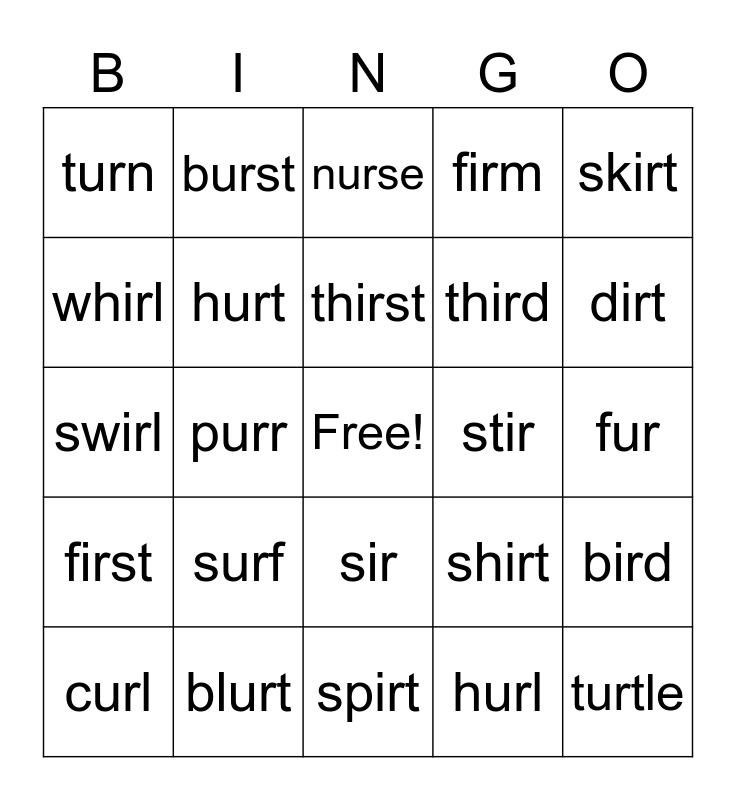 This bingo card has a free space and 29 words: curl, purse, purr, burn, turn, nurse, hurt, surf, stir, blurt, fur, turtle, spirt, hurl, dirt, girl, sir, first, skirt, swirl, shirt, birth, third, whirl, firm, burst, bird, thirst and circus.