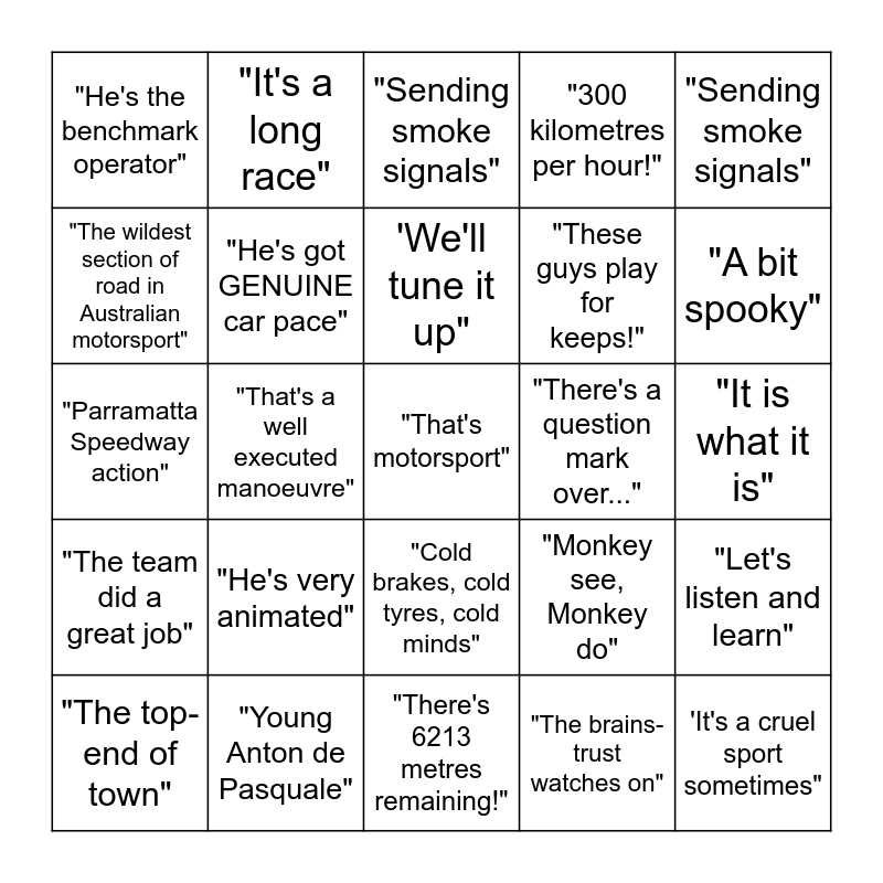 This bingo card has a free space and 24 words: "He's very animated", "Young Anton de Pasquale", 'We'll tune it up", "The top-end of town", "Sending smoke signals", "He's the benchmark operator", "The wildest section of road in Australian motorsport", "It's a long race", "There's a question mark over...", "Cold brakes, cold tyres, cold minds", "These guys play for keeps!", "Parramatta Speedway action", "Monkey see, Monkey do", "Let's listen and learn", "He's got GENUINE car pace", "The brains-trust watches on", "It is what it is", "Sending smoke signals", "A bit spooky", "That's a well executed manoeuvre", 'It's a cruel sport sometimes", "The team did a great job", "300 kilometres per hour!" and "There's 6213 metres remaining!".