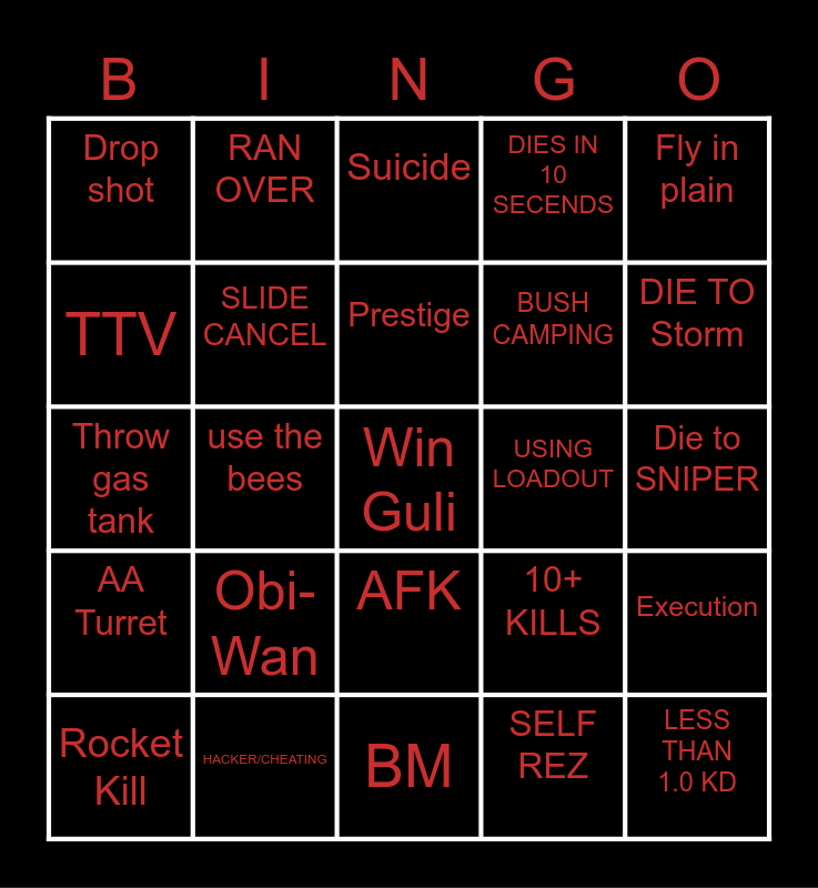 This bingo card has a free space and 24 words: Obi-Wan, HACKER/CHEATING, Prestige, Rocket Kill, Fly in plain, Drop shot, TTV, RAN OVER, USING LOADOUT, AFK, BUSH CAMPING, Throw gas tank, 10+ KILLS, Execution, SLIDE CANCEL, SELF REZ, Die to SNIPER, Suicide, DIE TO Storm, use the bees, LESS THAN 1.0 KD, AA Turret, DIES IN 10 SECENDS and BM.