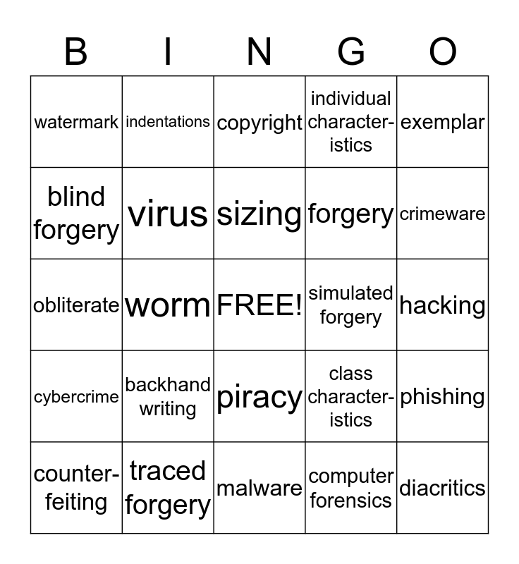 This bingo card has a free space and 24 words: backhand writing, traced forgery, sizing, counter-feiting, exemplar, watermark, blind forgery, indentations, simulated forgery, piracy, forgery, obliterate, class character-istics, phishing, virus, computer forensics, hacking, copyright, crimeware, worm, diacritics, cybercrime, individual character-istics and malware.