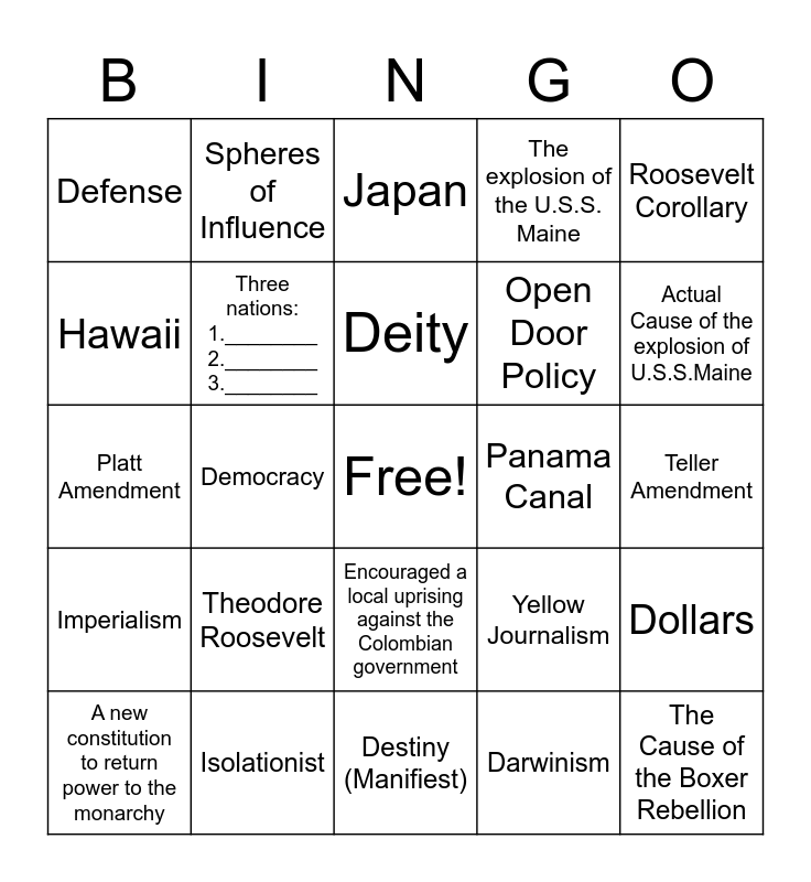 This bingo card has a free space and 29 words: A new constitution to return power to the monarchy, Chinese Nationalist, Democracy, Rough Riders, Defense, Japan, Three nations: 1.________ 2.________ 3.________, Theodore Roosevelt, Panama Canal, Isolationist, Teller Amendment, The Cause of the Boxer Rebellion, Destiny (Manifiest), Darwinism, Actual Cause of the explosion of U.S.S.Maine, Seward's Folly, Encouraged a local uprising against the Colombian government, Imperialism, Roosevelt Corollary, Platt Amendment, Yellow Journalism, Yellow Fever and Malaria, Open Door Policy, Hawaii, The explosion of the U.S.S. Maine, Spheres of Influence, Dollars, Deity and Monroe Doctrine.