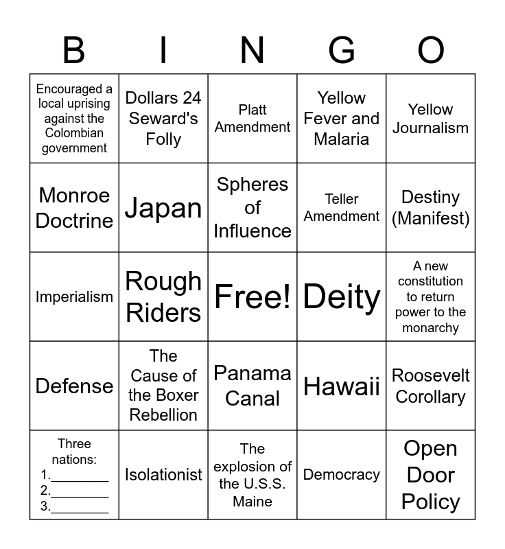 This bingo card has a free space and 28 words: Roosevelt Corollary, Theodore Roosevelt, Teller Amendment, Democracy, Monroe Doctrine, Platt Amendment, Dollars 24 Seward's Folly, Defense, Deity, Three nations: 1.________ 2.________ 3.________, Imperialism, Yellow Fever and Malaria, Isolationist, The explosion of the U.S.S. Maine, Destiny (Manifest), Darwinism, The Cause of the Boxer Rebellion, Japan, Spheres of Influence, Panama Canal, Encouraged a local uprising against the Colombian government, Actual Cause of the explosion of U.S.S.Maine, Open Door Policy, Rough Riders, A new constitution to return power to the monarchy, Hawaii, Yellow Journalism and Chinese Nationalist.