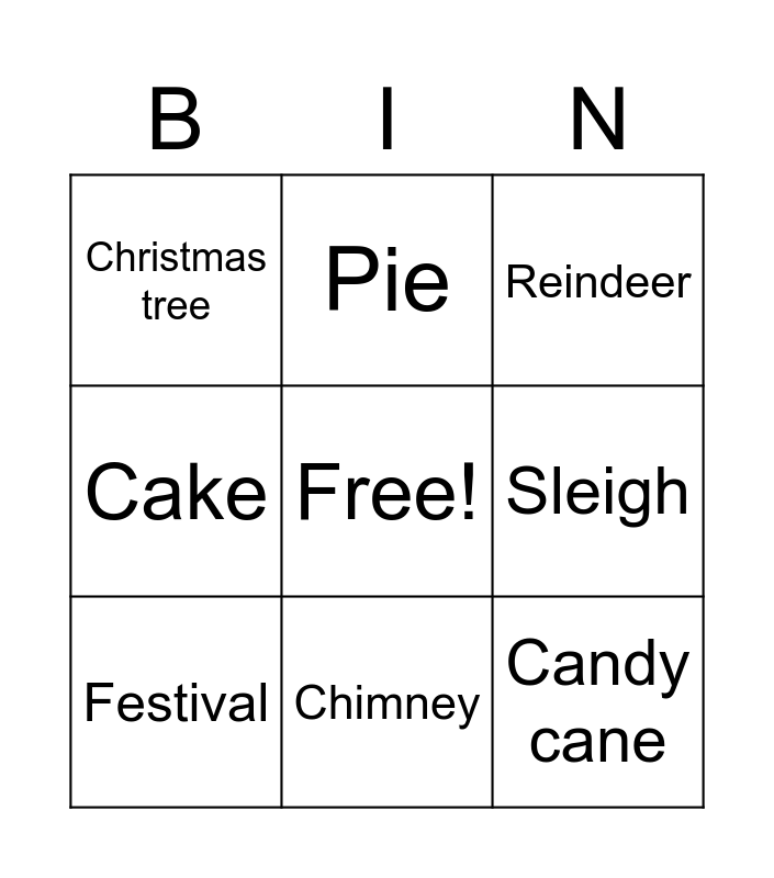This bingo card has a free space and 17 words: Chirstmas, Christ, Reindeer, Christmas tree, Party, Cake, December, Festival, Chimney, Sleigh, Present, Ginger bread, Candy cane, Pie, Sleighbells, Holly and Snowman.