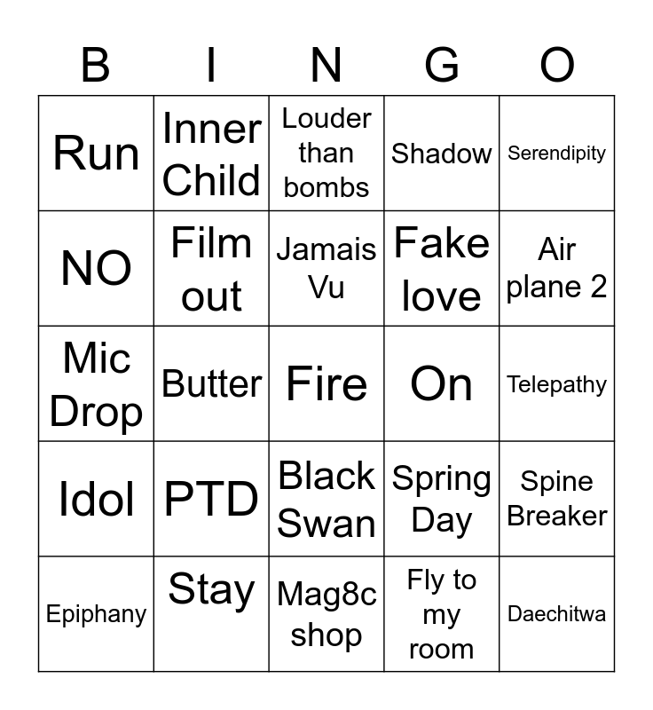 This bingo card has a free space and 24 words: PTD, Stay, Jamais Vu, Epiphany, Serendipity, Run, NO, Inner Child, On, Black Swan, Fake love, Mic Drop, Spring Day, Spine Breaker, Film out, Fly to my room, Telepathy, Louder than bombs, Air plane 2, Butter, Daechitwa, Idol, Shadow and Mag8c shop.