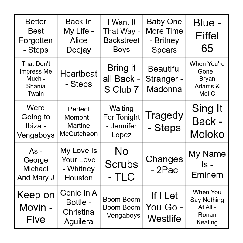 This bingo card has 45 words: Mambo No. 5 - Lou Bega, Waiting For Tonight - Jennifer Lopez, Livin' la Vida Loca - Ricky Martin, Keep on Movin - Five, When The Going Gets Tough - Boyzone, If I Let You Go - Westlife, I Want It That Way - Backstreet Boys, Bailamos - Enrique Iglesias, Blue - Eiffel 65, Genie In A Bottle - Christina Aguilera, Baby One More Time - Britney Spears, Tragedy - Steps, No Scrubs - TLC, My Love Is Your Love - Whitney Houston, Man I Feel Like A Woman - Shania Twain, Boom Boom Boom Boom - Vengaboys, Better Off Alone - Alice Deejay, Were Going to Ibiza - Vengaboys, What I Am - Tin Tin Out, When You're Gone - Bryan Adams & Mel C, Back In My Life - Alice Deejay, Believe - Cher, Sweet Like Chocolate - Shanks & Bigfoot, Better Best Forgotten - Steps, King Of My Castle - Wamdue Project, Sing It Back - Moloko, Tequila - Terrorvision, 2 Times - Ann Lee, Changes - 2Pac, As - George Michael And Mary J, Flying Without Wings - Westlife, My Name Is - Eminem, Praise You - Fatboy Slim, Pretty Fly For a White Guy - The Offspring, I Try - Macy Gray, Perfect Moment - Martine McCutcheon, Runaway - The Corrs, A Little bit More - 911, When You Say Nothing At All - Ronan Keating, Bring it all Back - S Club 7, That Don't Impress Me Much - Shania Twain, Beautiful Stranger - Madonna, End Of The Line - Honeyz, Heartbeat - Steps and Blame it on the Weatherman - B*Witched.