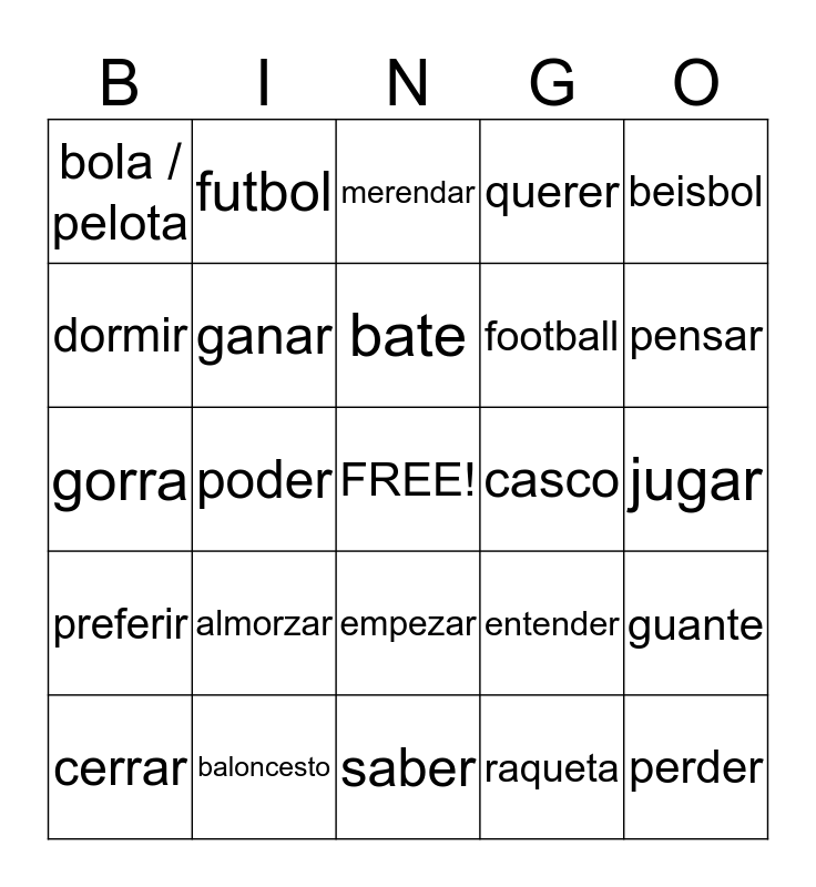This bingo card has a free space and 24 words: almorzar, baloncesto, bate, cerrar, beisbol, bola / pelota, dormir, futbol, casco, empezar, football, gorra, entender, guante, ganar, raqueta, jugar, merendar, pensar, poder, perder, preferir, querer and saber.