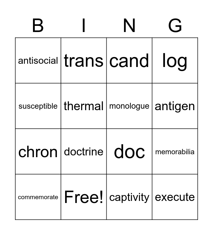 This bingo card has 28 words: phobia, arch, chron, chronic, thermal, cand, trans, execute, Free!, evict, doc, log, anti, docent, doctrine, illogical, prologue, monologue, antigen, antipathy, antisocial, antiperspirant, commemorate, memorabilia, captivity, cept/cap/ceive, susceptible and miss/mit.