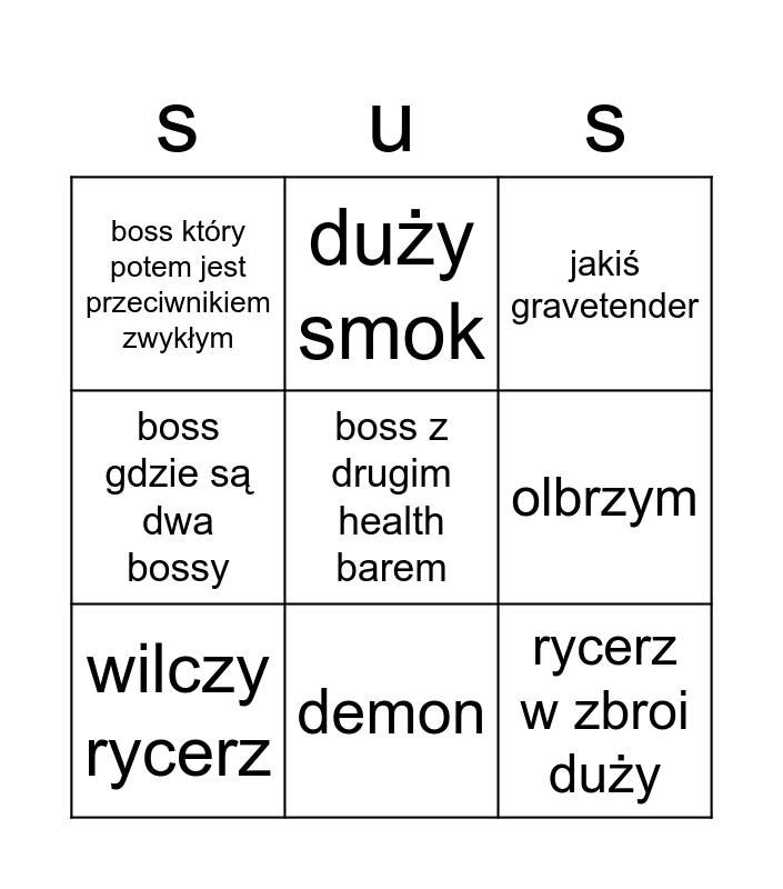 This bingo card has 9 words: wilczy rycerz, jakiś gravetender, duży smok, boss gdzie są dwa bossy, boss który potem jest przeciwnikiem zwykłym, olbrzym, boss z drugim health barem, rycerz w zbroi duży and demon.