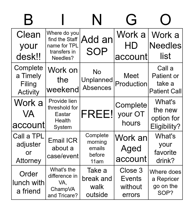 This bingo card has a free space and 24 words: Email ICR about a case/event, What's the difference in VA, ChampVA and Tricare?, No Unplanned Absences, Order lunch with a friend, Work a Needles list, Clean your desk!!, Complete a Timely Filing Activity, Where do you find the Staff name for TPL transfers in Needles?, Complete your OT hours, Complete morning emails before 11am, Meet Production, Work a VA account, Work an Aged account, What's your favorite drink?, Work on the weekend, Close 3 Events without errors, What's the new option for Eligibility?, Add an SOP, Call a Patient or take a Patient Call, Provide lien threshold for Eastar Health System, Where does a Repricer go on the SOP?, Call a TPL adjuster or Attorney, Work a HD account and Take a break and walk outside.