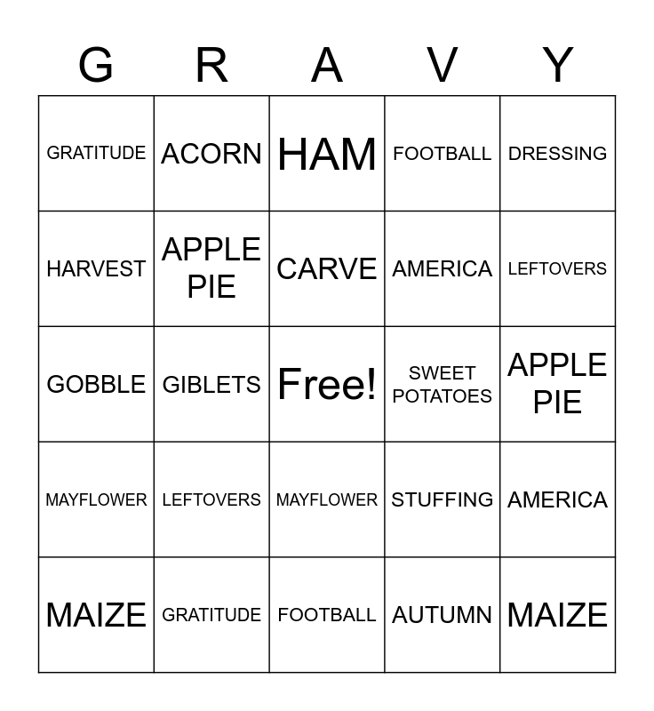 ⚠ This card has duplicate items: LEFTOVERS (3), MAIZE (3), MAYFLOWER (3), PARADE (3), PIE (3), PUMPKIN (3), STUFFING (3), SWEET POTATOES (3), TABLECLOTH (3), THANKFUL (3), THURSDAY (3), ACORN (3), AMERICA (3), APPLE PIE (3), AUTUMN (3), CARVE (3), CORNBREAD (3), CORNUCOPIA (3), CRANBERRIES (3), DRESSING (3), FAMILY (3), FEAST (3), FOOTBALL (3), GIBLETS (3), GOBBLE (3), GRATITUDE (3), GRAVY (3), HAM (3), HARVEST (3), HOLIDAY (2)