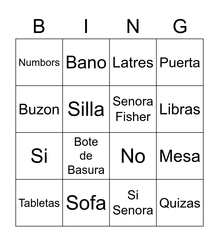 This bingo card has 16 words: Sofa, Mesa, Latres, Numbors, Si, Bano, No, Si Senora, Buzon, Silla, Tabletas, Puerta, Bote de Basura, Libras, Senora Fisher and Quizas.