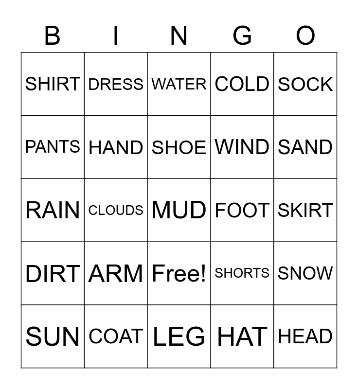 This bingo card has 26 words: Free!, HAT, SHOE, COAT, SOCK, SHIRT, PANTS, DRESS, SKIRT, SHORTS, WIND, RAIN, SNOW, SUN, CLOUDS, HOT, COLD, DIRT, WATER, MUD, SAND, LEG, FOOT, ARM, HAND and HEAD.
