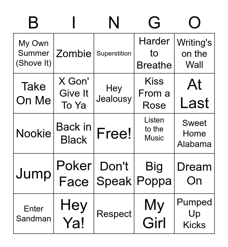 This bingo card has a free space and 34 words: Chop Suey!, My Girl, Holiday, Cupid, Jump, X Gon' Give It To Ya, Writing's on the Wall, Enter Sandman, Zombie, Somewhere I Belong, Hey Jealousy, Superstition, Skyfall, More Than A Feeling, Listen to the Music, At Last, Hey Ya!, Nookie, Poker Face, Big Poppa, Don't Speak, If I Ain't Got You, My Own Summer (Shove It), Sweet Home Alabama, Respect, Pumped Up Kicks, Harder to Breathe, Crank That, Kiss From a Rose, Take On Me, In Bloom, Back in Black, Dream On and Savage.