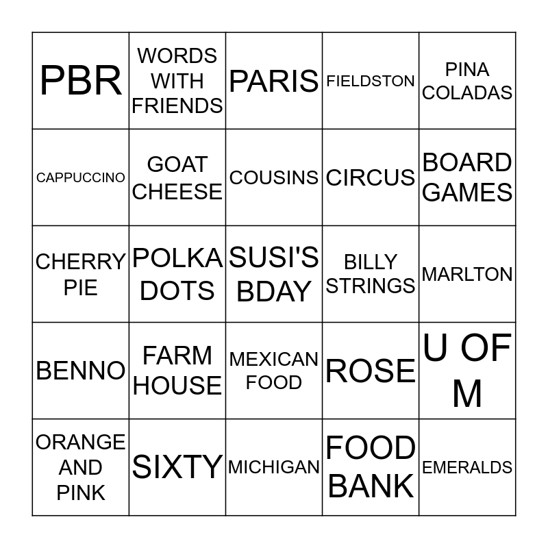 This bingo card has a free space and 24 words: FARM HOUSE, SIXTY, COUSINS, ORANGE AND PINK, PINA COLADAS, PBR, CAPPUCCINO, WORDS WITH FRIENDS, BILLY STRINGS, MEXICAN FOOD, CIRCUS, CHERRY PIE, ROSE, U OF M, GOAT CHEESE, FOOD BANK, MARLTON, PARIS, BOARD GAMES, POLKA DOTS, EMERALDS, BENNO, FIELDSTON and MICHIGAN.