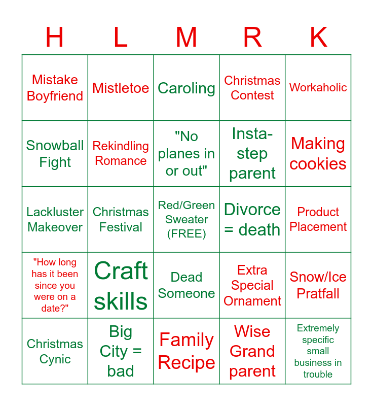 This bingo card has a free space and 35 words: Hot Cocoa, Dead-eyed child actor, Actual Magic, Rekindling Romance, Dead Someone, Christmas Contest, Snowball Fight, Christmas Store, "No planes in or out", Expressive Pet, Lackluster Makeover, Workaholic, Christmas Dance, Tree Decorating, Mistake Boyfriend, Divorce = death, Wise Grand parent, Christmas Festival, "How long has it been since you were on a date?", Extremely specific small business in trouble, Extra Special Ornament, Christmas Cynic, Snow/Ice Pratfall, Big City = bad, Caroling, Making cookies, Sassy friend, Almost Kiss, Insta- step parent, Product Placement, Exotic Location clearly Canada, Family Recipe, Craft skills, Mistletoe and Sleigh ride.