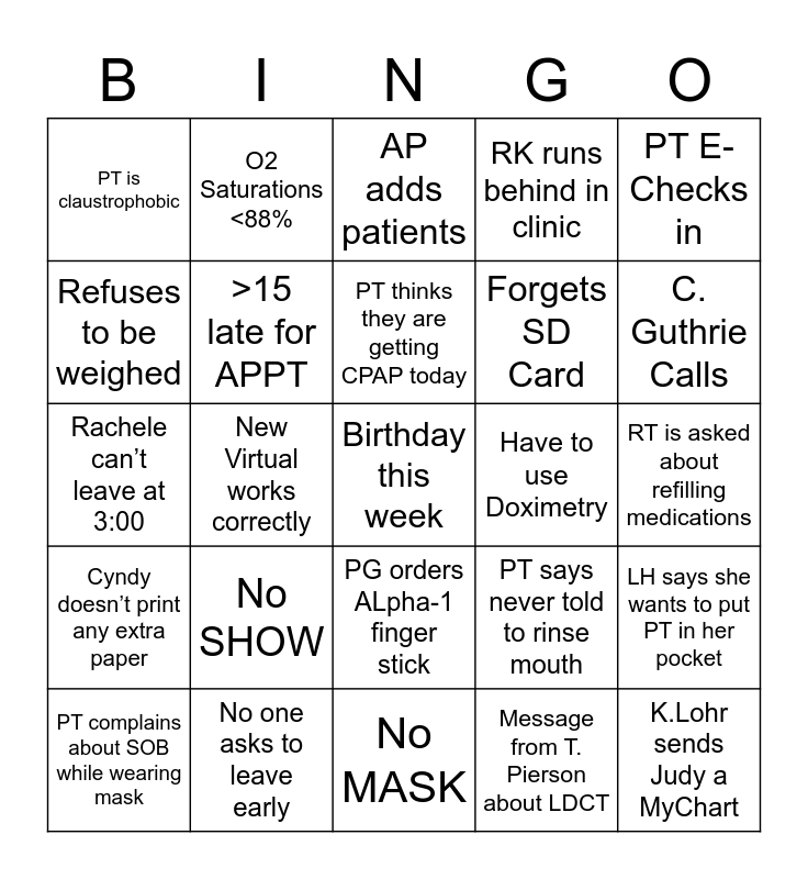 This bingo card has 50 words: Free!, Birthday this week, COVID tested this week, No MASK, No SHOW, Complaints about DME, O2 Saturations <88%, Complains about the forms, Refuses to be weighed, Loves CPAP, >15 late for APPT, RK runs behind in clinic, LH says she wants to put PT in her pocket, PT says never told to rinse mouth, PT in wrong office, Deb wants help in another clinic, PT thinks they are getting CPAP today, Have to use Doximetry, Traveled outside the state, PT E-Checks in, New Virtual works correctly, Message from T. Pierson about LDCT, PT is claustrophobic, Forgets SD Card, Thanks a healthcare worker, K.Lohr sends Judy a MyChart, C. Guthrie Calls, Providers want RT to mask fit, AP adds patients, PG orders ALpha-1 finger stick, Walk PT, wheelchair bound, Funeral home calls RE: death certificate, Joann rooms a PT without mask on, MD Education actually happens, No one asks to leave early, Drug rep brings cookies, Drug rep asks about lunches, Apnea Link is ordered, PT asks about COPD Gummies, RT is asked about refilling medications, DONUT HOLE, Marissa taps her soda can, Trips getting off scale, PT asks for disability paperwork filled out, PT complains about SOB while wearing mask, Rachele can’t leave at 3:00, No staff calls off work all week, Staff (not Joann) creates a new process, Cyndy doesn’t print any extra paper and Eric brings up 10 sleep tests at once.