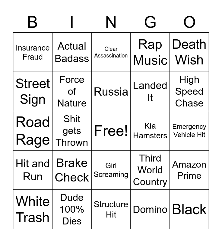 This bingo card has a free space and 44 words: Semi Doesn't Fit, Black, Mexican, White Trash, Power Line, Domino, Clear Assassination, No Bumpers, Death Wish, Dude 100% Dies, Rap Music, Kia Hamsters, Girl Screaming, Brake Check, Mailbox, Structure Hit, Crackheads, Road Rage, Pulled Over, High Speed Chase, Actual Badass, Dumb Motorcyclist, Animal Involved, Insurance Fraud, Car On Fire, Emergency Vehicle Hit, Dashcam Car Hit, Love Tap, Third World Country, Hit and Run, Unsecured Load, Amazon Prime, Nice Car Hit, Tire Missing, Shit gets Thrown, Runs a Light, Sick Drift, British, Russia, Street Sign, Landed It, Pit Maneuver, Force of Nature and Idiot Spins Out.