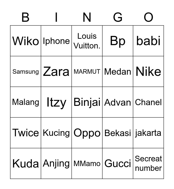 This bingo card has a free space and 24 words: Kucing, Anjing, MARMUT, Kuda, babi, Wiko, Samsung, Iphone, Advan, Oppo, Medan, Malang, Bekasi, jakarta, Zara, Gucci, Chanel, Louis Vuitton., Nike, Itzy, Secreat number, Twice, Bp and MMamo.