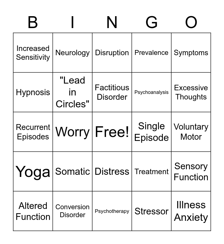 This bingo card has a free space and 24 words: Somatic, Conversion Disorder, Factitious Disorder, Altered Function, Symptoms, Increased Sensitivity, Hypnosis, Neurology, Single Episode, Distress, Psychoanalysis, Recurrent Episodes, Treatment, Sensory Function, "Lead in Circles", Stressor, Voluntary Motor, Disruption, Excessive Thoughts, Worry, Illness Anxiety, Yoga, Prevalence and Psychotherapy.