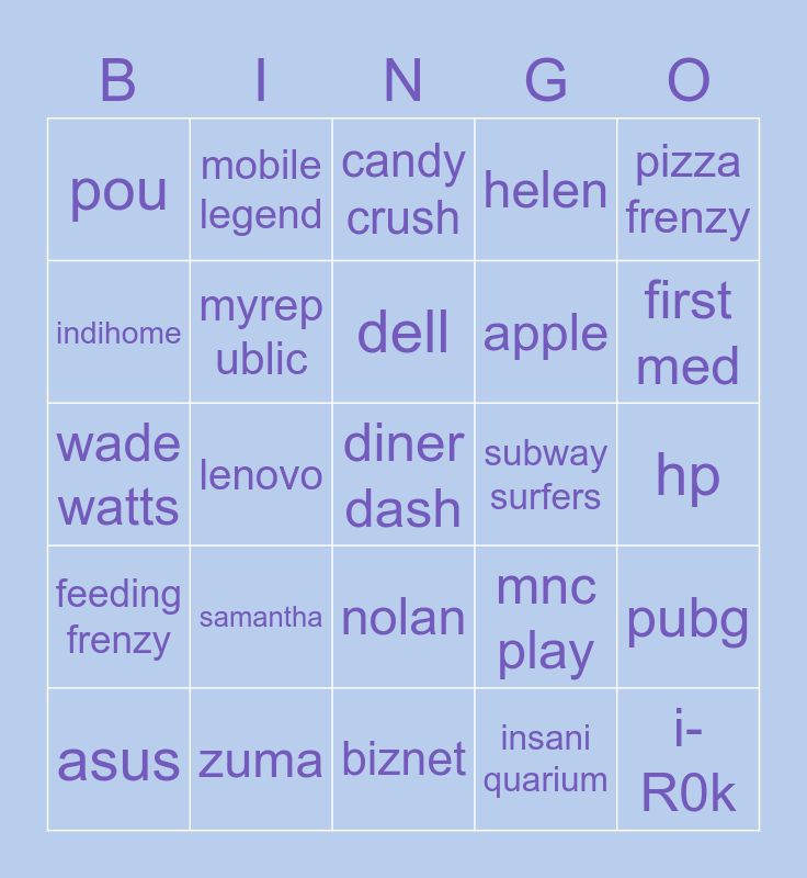 This bingo card has 25 words: feeding frenzy, zuma, diner dash, insani quarium, pizza frenzy, pou, mobile legend, candy crush, subway surfers, pubg, indihome, myrep ublic, biznet, mnc play, first med, asus, lenovo, dell, apple, hp, wade watts, samantha, nolan, helen and i-R0k.