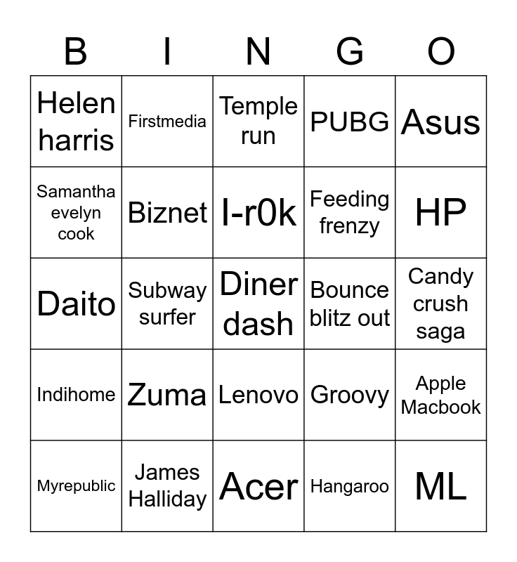 This bingo card has a free space and 24 words: Zuma, James Halliday, I-r0k, Myrepublic, Asus, Helen harris, Samantha evelyn cook, Firstmedia, Bounce blitz out, Lenovo, Feeding frenzy, Daito, Groovy, Apple Macbook, Biznet, Hangaroo, Candy crush saga, Temple run, HP, Subway surfer, ML, Indihome, PUBG and Acer.