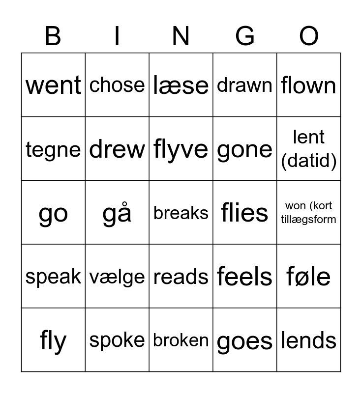 This bingo card has 50 words: brække, breaks, broke, broken, vælge, chooses, chose, chosen, tegne, draws, drew, drawn, føle, feels, felt (datid), felt (kort tillægsform), flyve, flies, flew, flown, gå, goes, went, gone, udlåne, lends, lent (datid), lent (kort tillægsform), læse, reads, read (datid), read (kort tillægsform), tale, speaks, spoke, spoken, vinde, wins, won (datid), won (kort tillægsform, break, choose, draw, feel, fly, go, lend, read (navneform), speak and win.