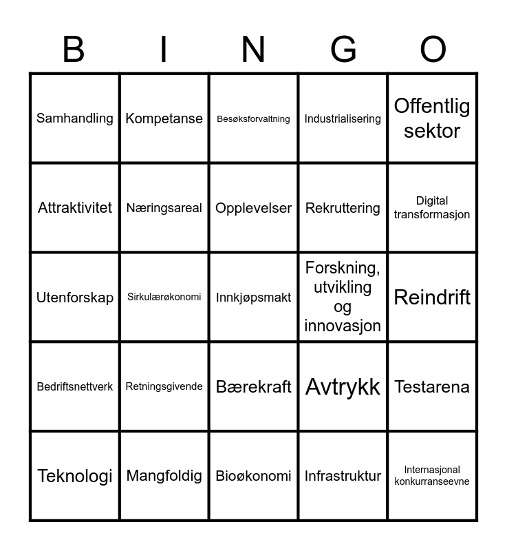 This bingo card has 25 words: Retningsgivende, Bioøkonomi, Opplevelser, Teknologi, Offentlig sektor, Samhandling, Attraktivitet, Kompetanse, Forskning, utvikling og innovasjon, Bærekraft, Rekruttering, Utenforskap, Avtrykk, Testarena, Næringsareal, Internasjonal konkurranseevne, Reindrift, Besøksforvaltning, Digital transformasjon, Sirkulærøkonomi, Innkjøpsmakt, Mangfoldig, Bedriftsnettverk, Industrialisering and Infrastruktur.