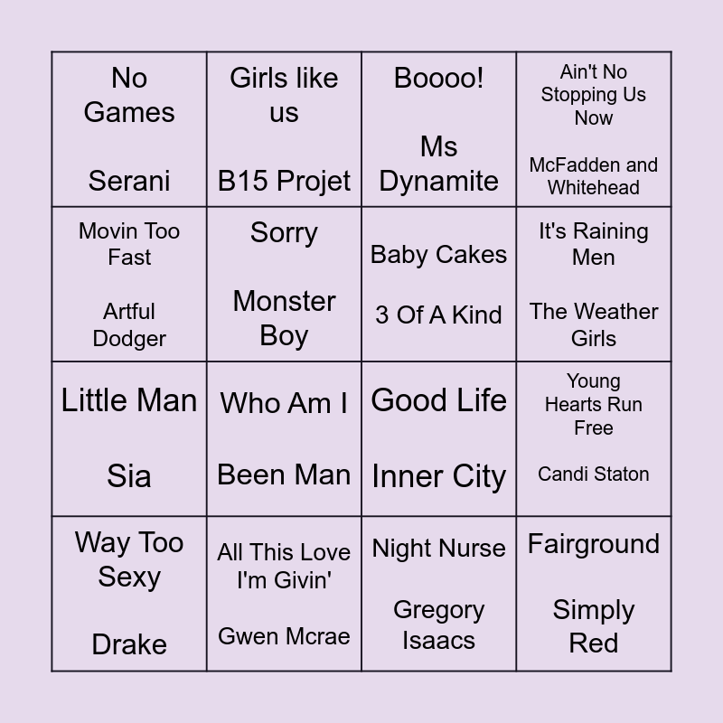 This bingo card has 41 words: Rollercoaster Ronan Keating, Good Life Inner City, Ride On Time Black Box, Baby Cakes 3 Of A Kind, Back to Life Soul II Soul, Stayin Alive Bee Gees, It's Raining Men The Weather Girls, So You Win Again Hot Chocolate, Movin Too Fast Artful Dodger, Fairground Simply Red, Young Hearts Run Free Candi Staton, Ain't No Stopping Us Now McFadden and Whitehead, Way Too Sexy Drake, Night Nurse Gregory Isaacs, All This Love I'm Givin' Gwen Mcrae, Silly Games Janet Kay, Neighbourhood Zed Bias, No Games Serani, In The Morning Egypt, Boooo! Ms Dynamite, Rhythm Is A Dancer Snap, Love And Affection Pressure, The Cure And The Cause Fish Go Deep, Little Man Sia, Body Tion Wayne & Russ Millions, 21 Seconds So Solid Crew, Ain't Nobody Chaka Khan, My Love Kele Le Roc, Who Am I Been Man, Push The Feeling On Nightcrawlers, Believe Cher, Girls like us B15 Projet, Talkin The Hardest Giggs, Clive dances to jungle, Tempted To Touch Beres Hammond, Sorry Monster Boy, Incredible M Beat feat General Levy, Party Hard Donaeo, Pump Technotronic, Never Gonna Let You Go Tina Moore and Little Bit Of Luck DJ Luck and MC Neat.