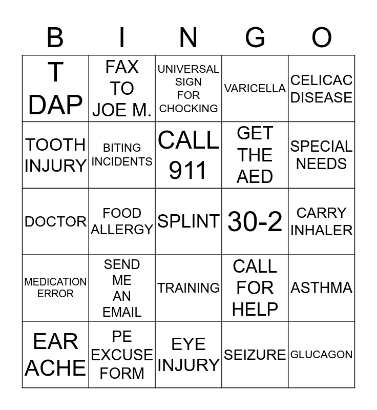 This bingo card has 25 words: SEND ME AN EMAIL, EYE INJURY, CALL 911, EAR ACHE, CELICAC DISEASE, T DAP, TOOTH INJURY, FAX TO JOE M., 30-2, TRAINING, GET THE AED, DOCTOR, CALL FOR HELP, ASTHMA, BITING INCIDENTS, GLUCAGON, CARRY INHALER, UNIVERSAL SIGN FOR CHOCKING, SPECIAL NEEDS, FOOD ALLERGY, SPLINT, PE EXCUSE FORM, MEDICATION ERROR, VARICELLA and SEIZURE.