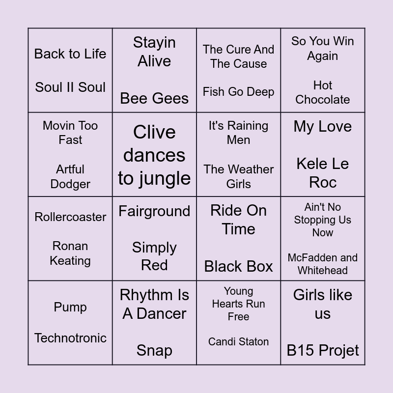 This bingo card has 23 words: Rollercoaster Ronan Keating, Good Life Inner City, Ride On Time Black Box, Baby Cakes 3 Of A Kind, Back to Life Soul II Soul, Stayin Alive Bee Gees, It's Raining Men The Weather Girls, So You Win Again Hot Chocolate, Movin Too Fast Artful Dodger, Fairground Simply Red, Young Hearts Run Free Candi Staton, Ain't No Stopping Us Now McFadden and Whitehead, Pump Technotronic, Rhythm Is A Dancer Snap, All This Love I'm Givin' Gwen Mcrae, Believe Cher, The Cure And The Cause Fish Go Deep, Ain't Nobody Chaka Khan, My Love Kele Le Roc, Girls like us B15 Projet, Clive dances to jungle, Tempted To Touch Beres Hammond and Sorry Monster Boy.