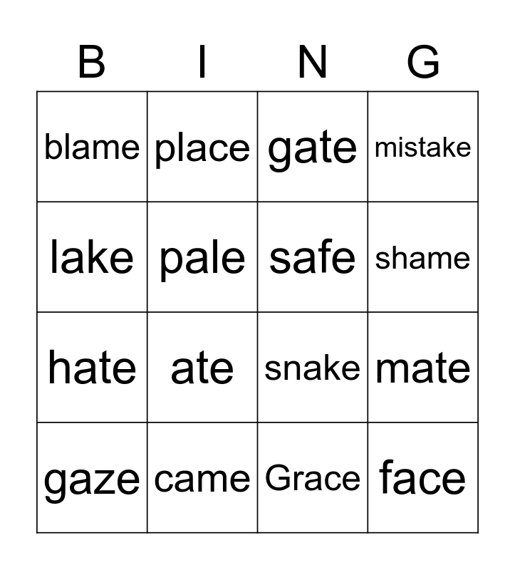 This bingo card has 20 words: mate, take, gate, shake, gaze, lake, came, blame, hate, place, ate, snake, pale, face, safe, stage, shame, mistake, Grace and Jake.
