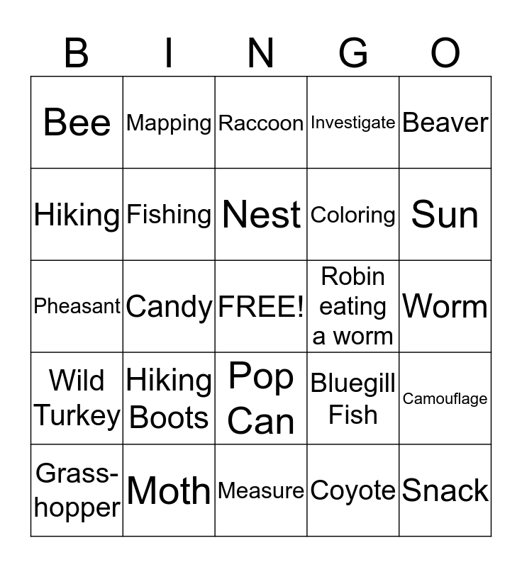 This bingo card has a free space and 24 words: Hiking Boots, Moth, Nest, Grass-hopper, Beaver, Bee, Hiking, Mapping, Robin eating a worm, Pop Can, Coloring, Pheasant, Bluegill Fish, Camouflage, Fishing, Coyote, Worm, Raccoon, Sun, Candy, Snack, Wild Turkey, Investigate and Measure.