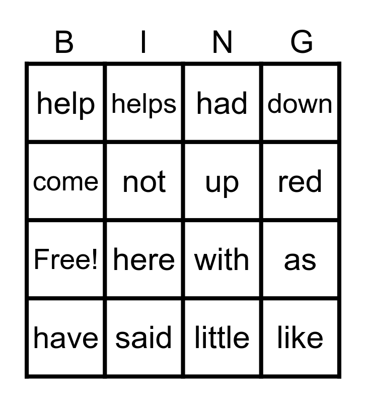 This bingo card has 20 words: as, run, had, want, have, come, said, help, Free!, helps, here, with, not, like, up, us, red, down, little and jump.