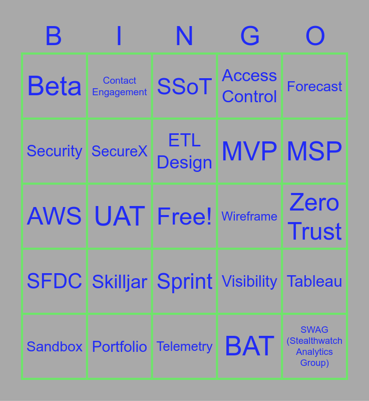 This bingo card has a free space and 50 words: Stealthwatch, SWAG (Stealthwatch Analytics Group), Xyleme, Telemetry, Skilljar, Digital Journey, Contact Engagement, OKRs, Security, Stakeholders, SecureX, Access Control, Tableau, Visibility, SecOPS, Deployment, ETL Design, Wireframe, Reporting, Forecast, UAT, BAT, Beta, MVP, GA, AMP4E, MSP, BRD, SSoT, Sprint, Scrum, Adoption, ROI, SBG, Portfolio, Integration, Production, DEV, Environment, Zero Trust, Snowflake, Stakeholder, KPI, Cloud, Sandbox, AWS, Endpoint, Execution, SFDC and iOps.