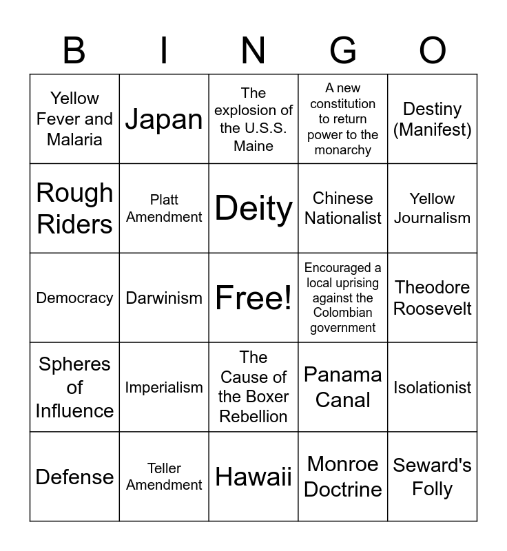 This bingo card has a free space and 28 words: Isolationist, Open Door Policy, Chinese Nationalist, Monroe Doctrine, Rough Riders, The explosion of the U.S.S. Maine, Japan, Spheres of Influence, Encouraged a local uprising against the Colombian government, Defense, Democracy, A new constitution to return power to the monarchy, Teller Amendment, Hawaii, Yellow Journalism, Roosevelt Corollary, Imperialism, Platt Amendment, Deity, The Cause of the Boxer Rebellion, Yellow Fever and Malaria, Dollars, Seward's Folly, Darwinism, Theodore Roosevelt, Panama Canal, Destiny (Manifest) and Three nations: 1.________ 2.________ 3.________.